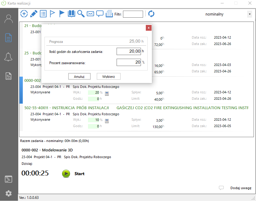Rejestrując godziny pracy poświęcane na prace projektowe informujemy firmę o tym w jaki sposób, na bieżąco, konsumowany jest dostępny budżet. Zbieranie informacji o godzinach to jednak zbyt mało, by odwzorować sytuację projektu. Jednocześnie system pyta projektanta o to jaki jest progres. Może to być dość abstrakcyjne pytanie o zaawansowanie procentowe, może być to bliższe inżynierom pytanie o ilość godzin jaka pozostała do końca pracy. Doświadczony inżynier na każdym etapie realizacji może bez problemu oszacować ile czasu potrzebuje do zakończenia projektu, szczególnie gdy przyjmiemy, że nie wystąpią żadne zakłócenia. W rzeczywistości zakłócenia występują i w przeciwieństwie do przepracowanych godzin, których ilość może tylko rosnąć, to zaawansowanie pracy projektowej może każdego dnia praktycznie dowolnie zmieniać się w przedziale od zera do 100%.