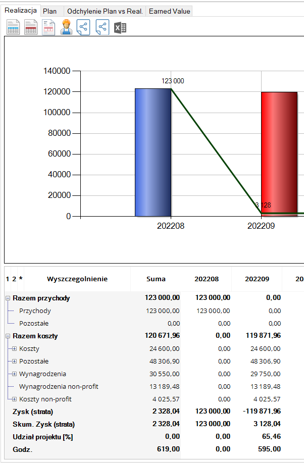 Na przedstawionym poniżej przykładzie widać, że zastosowano podział kosztów pozostałych (ogólnozakładowych) na rodzaje i wyliczono je dla projektu poprzez przemnożenie sumy wszystkich kosztów ogólnozakładowych w firmie przez wartość 0,6546 to oznacza, że około 65% wszystkich kosztów ogólnozakładowych obciąża ten projekt. Jak widać na poniższym przykładzie koszty zakupów związanych z realizacją projektu wynoszą 24600 zł, koszty wynagrodzeń projektantów realizujących projekt w miesiącu to kwota 29750 zł w tym samym okresie. Zatem koszty działań na które ma wpływ kierownik projektu wynoszą 54 350 zł. Mając na uwadze, że po stronie przychodowej w dniu rozpoczęcia realizacji projektu wpłynęła zaliczka w wysokości 123 000 zł, to z punktu widzenia kierownika projektu sytuacja finansowa jest bardzo dobra, wynik netto wynosi 68 650 złotych. Jednak po doliczeniu kosztów ogólnozakładowych w wysokości 65 521,05 zł, wynik projektu wynosi zaledwie 3 128, 04 zł. Ten rzeczywisty przykład pokazuje, jak ważne jest uwzględnianie kosztów ogólnozakładowych w analizie funkcjonowania firmy projektowej.