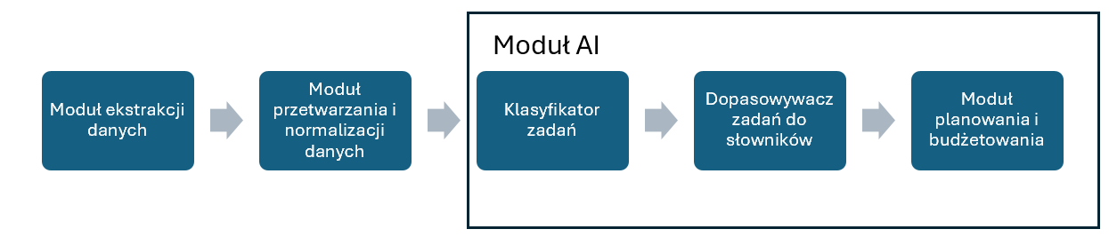 Rozpoczynając od modułu ekstrakcji danych, system automatycznie pobiera informacje o zadaniach z systemu Wayman ERP za pomocą skryptów ETL. Dane te obejmują szczegóły takie jak numer zadania, nazwa, branża, etap projektowania, terminy, budżet początkowy i rzeczywista alokacja. Następnie, moduł przetwarzania i normalizacji danych zapewnia jednolity format danych wejściowych przez standaryzację formatów dat, nazw i innych kluczowych atrybutów. Moduł AI składa się z podmodułów, w tym klasyfikatora zadań wykorzystującego algorytmy uczenia maszynowego do kategoryzacji zadań, „dopasowywacza” do słowników czynności bazującego na algorytmach przetwarzania języka naturalnego (NLP) oraz modułu planowania i budżetowania stosującego algorytmy predykcyjne. Do klasyfikacji zadań wykorzystujemy sieci neuronowe, które pozwalają na efektywne przyporządkowanie zadań do odpowiednich branż i etapów projektowych na podstawie ich opisów i metadanych. Dopasowywanie opisów zadań do elementów w znormalizowanych słownikach czynności wykorzystuje techniki NLP, w szczególności LDA, co umożliwia zrozumienie kontekstu i semantycznego znaczenia opisów zadań. Algorytmy regresji liniowej są wykorzystywane do przewidywania budżetów początkowych i rzeczywistych alokacji bazując na danych historycznych. System wyposażono w prosty interfejs użytkownika, który umożliwia łatwy dostęp do wyników klasyfikacji i analiz, spójny z interfejsem systemu Wayman ERP. Użytkownicy mogą również ręcznie korygować klasyfikacje i dopasowania, co stanowi ważny element uczenia maszynowego z nadzorem. Istotą tej funkcjonalności jest nie tylko zwiększenie poziomu akceptacji systemu przez użytkowników, ale również umożliwienie ciągłego ulepszania modeli poprzez interaktywne feedbacki.